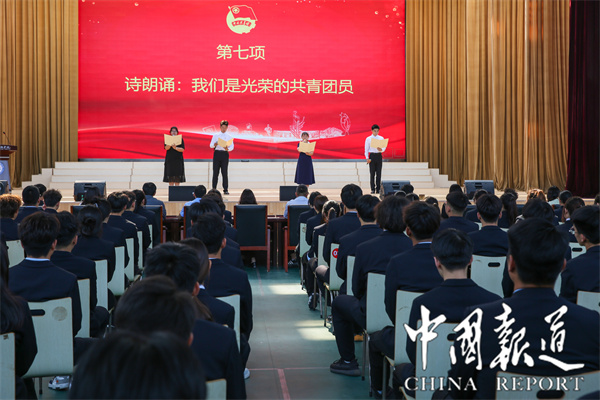 由李天宜等四位新老团员代表展演的诗朗诵《我们是光荣的共青团员》,歌颂了火热的青春,燃起了团员青年们干事创业的澎湃激情。